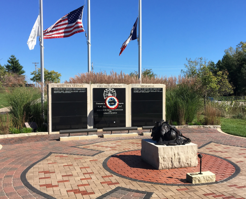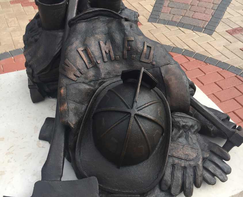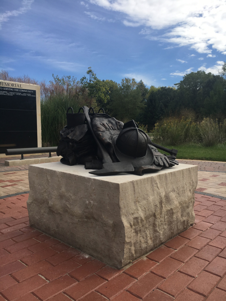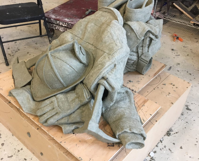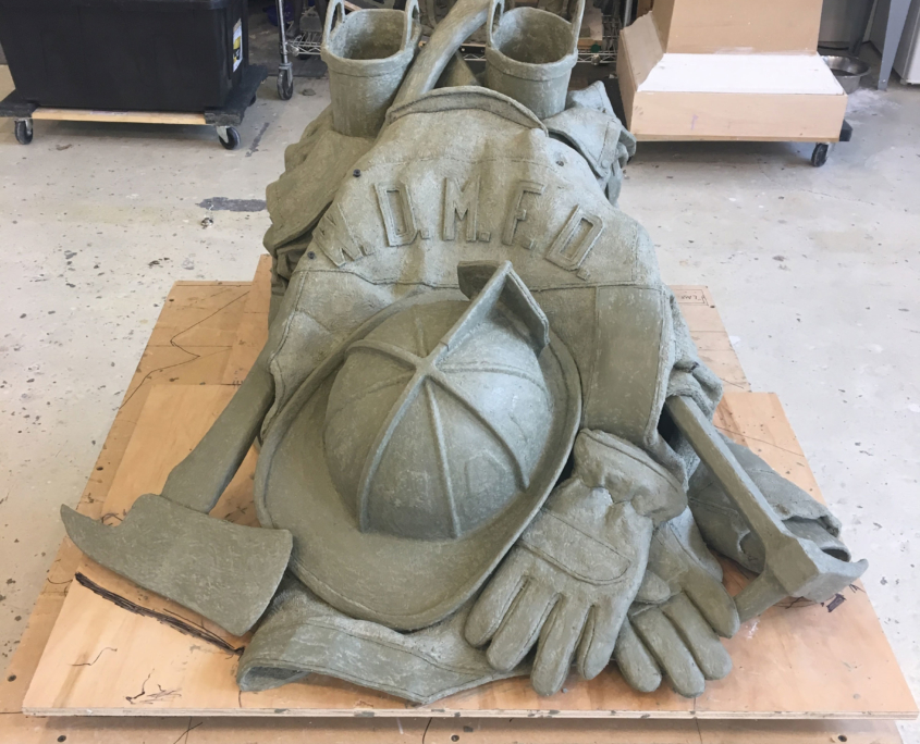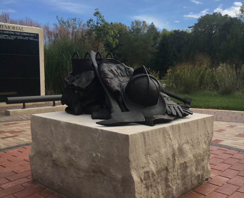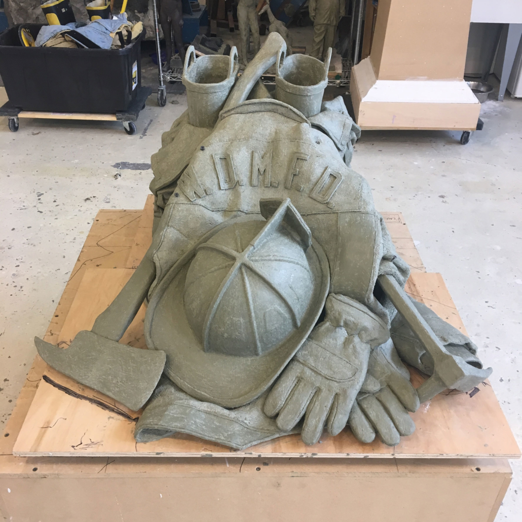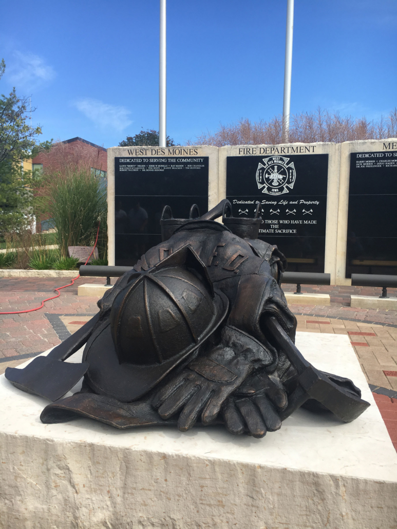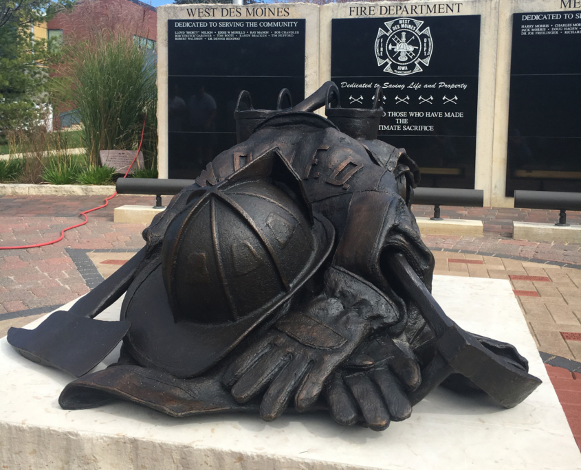 It was important to the firefighters of the West Des Moines Fire Department that the memorial be somber but not sad. Together we hit upon the idea of working with the concept of a firefighter just having laid their gear down after a fire and in preparation for the next one, never to return. It was incredibly moving to be there at the unveiling of the statue and the ringing of the four fives.